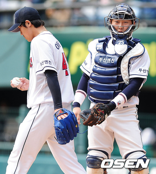 1회초 1사 1,3루에서 두산 이용찬이 넥센 오재일에 1타점 적시타를 허용하자 양의지가 격려하고 있다.