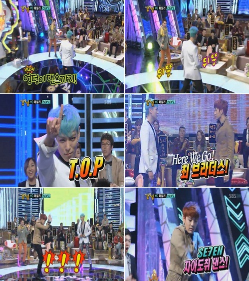 특히 예능 프로에서조차 좀처럼 흐트러진 모습을 보이지 않았던 탑은 MC 이승기의 즉석 댄스 요청에 엉덩이를 좌우로 흔들며 엉거주춤 댄스를 선보여 출연진을 폭소케 만들었고 결국 이승기, 세븐까지 댄스경연(?)에 합류케 했다.