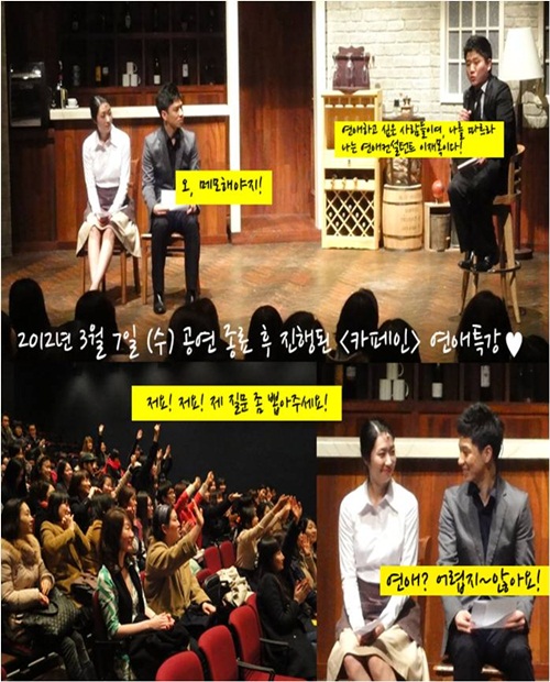 이 밖에 뮤지컬 '카페인'은 지난 7일 공연이 끝난 후 ‘연애특강’ 시간을 마련해 사전에 트위터를 통해 연애에 대한 질문을 받고 현장에서 이재목 연애컨설턴트가 직접 답변을 해주는 시간을 갖기도 했다.