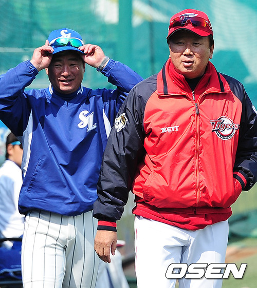 경기전 삼성 류중일 감독과 KIA 선동렬 감독이 인사를 나누고 있다.