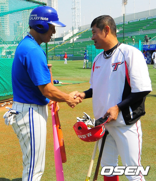 경기전 삼성 이승엽과 KIA 이종범이 인사를 나누고 있다.