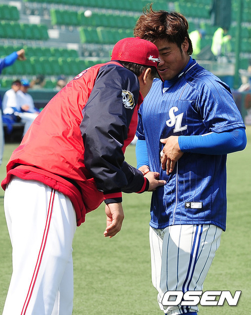 경기전 KIA 선동렬 감독이 삼성 박석민의 뱃살을 만지며 이야기를 나누고 있다.