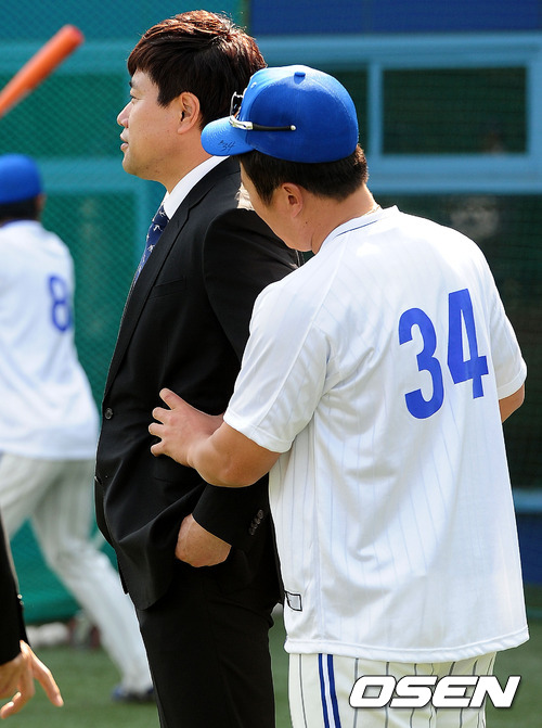 경기전 삼성 최형우가 양준혁 해설위원과 인사를 나누고 있다.