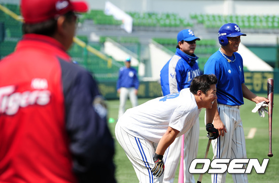 경기전 KIA 선동렬 감독이 삼성 최형우 이승엽의 훈련을 지켜보고 있다.