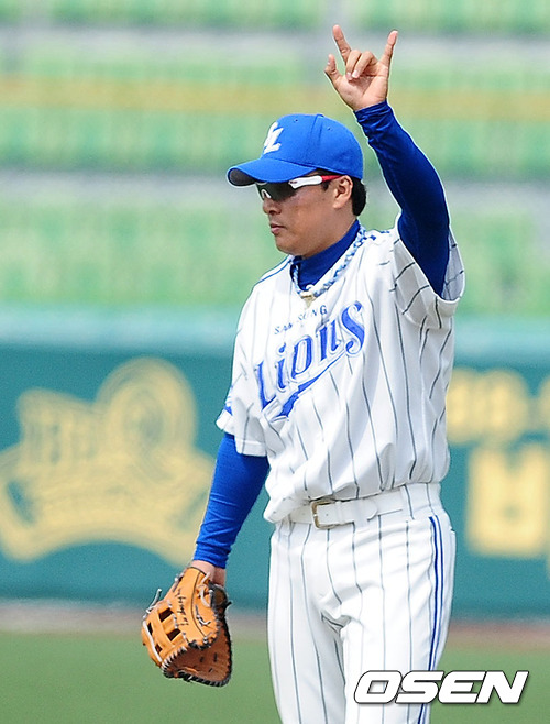 1회초 삼성 이승엽이 투아웃을 손짓으로 알리고 있다.