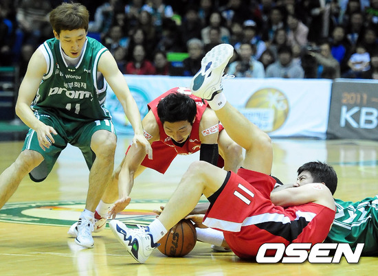 원주 동부는 지난 28일 원주 치악체육관에서 열린 2011-2012 KB 국민카드 남자 프로농구 챔피언결정전 1차전서 KGC 인삼공사를 80-75로 꺾고 기선 제압에 성공했다.
