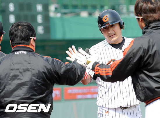 29일 오후 부산 사직구장에서 열린 프로야구 시범경기 롯데 자이언츠와 넥센 히어로즈의 경기 4회말 롯데 선두타자 문규현이 솔로홈런을 날리고 동료들의 축하를 받고 있다.