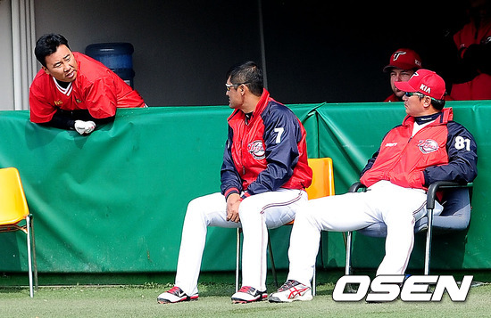 5회초 KIA 이범호가 이종범과 더그아웃에서 이야기를 나누고 있다.