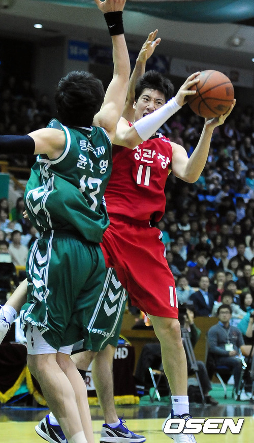 29일 오후 원주 치악체육관에서 열린 '2011-2012 KB국민카드 프로농구' 챔피언결정전 2차전 원주 동부와 안양 KGC 인삼공사의 경기 4쿼터 인삼공사 양희종이 윤호영에 막혀 볼을 돌리고 있다.