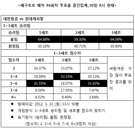 [배구토토] 국민체육진흥공단(www.kspo.or.kr)이 발행하는 체육진흥투표권 수탁사업자인 오리온그룹계열의 스포츠토토 공식 온라인 발매사이트 베트맨(www.betman.co.kr)이 오는 31일 오후 2시 인천도원체육관에서 열리는 남자배구 플레이오프 1차전인 대한항공-현대캐피탈전 대상 배구토토 매치 46회차 게임 투표율을 중간집계한 결과, 국내 배구팬들은 대한항공의 승리를 전망했다고 전했다.