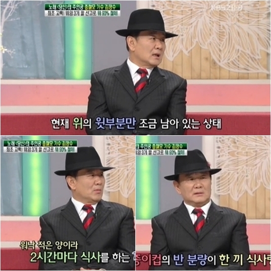 또 김정수는 “종이컵 반 분량을 두 시간 만에 한 번씩 먹는다”면서 “지금까지 자극적인 음식은 못 먹는다”고 전했다. 현재 김정수는 1년간의 항암 치료가 남아있는 상태이며 아직 다른 곳에 전이는 안 된 상태라고 한다.