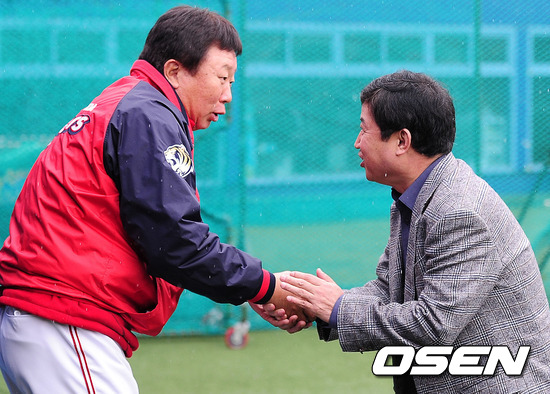 취소에 앞서 KIA 선동렬 감독과 삼성 송삼봉 단장이 인사를 나누고 있다.