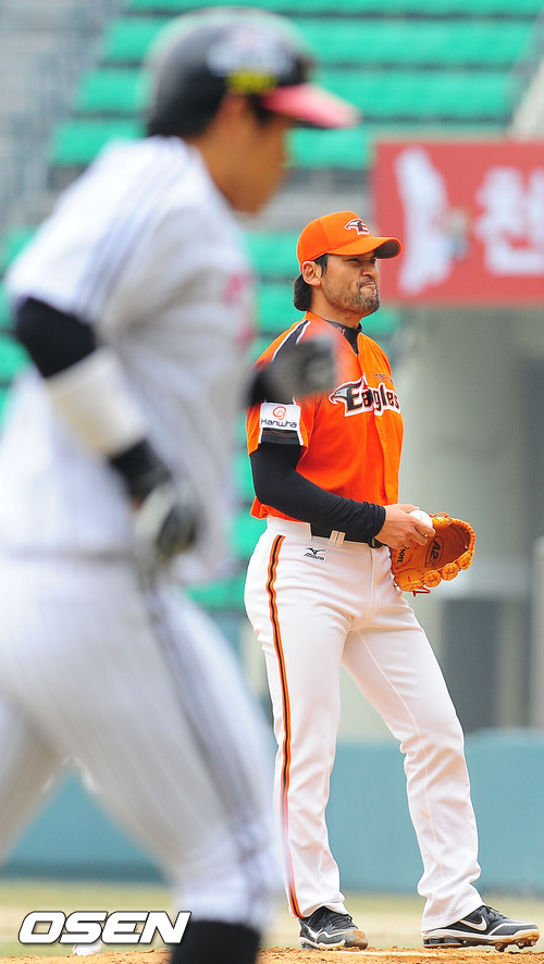 30일 오후 서울 잠실구장에서 LG 트윈스와 한화 이글스의 프로야구 시범경기에서 한화 선발 박찬호가 2회말 2사 주자 없는 상황에서 LG 유강남에게 좌중간 솔로홈런을 맞은 후 유강남이 그라운드를 돌때 얼굴을 찡그리고 있다.