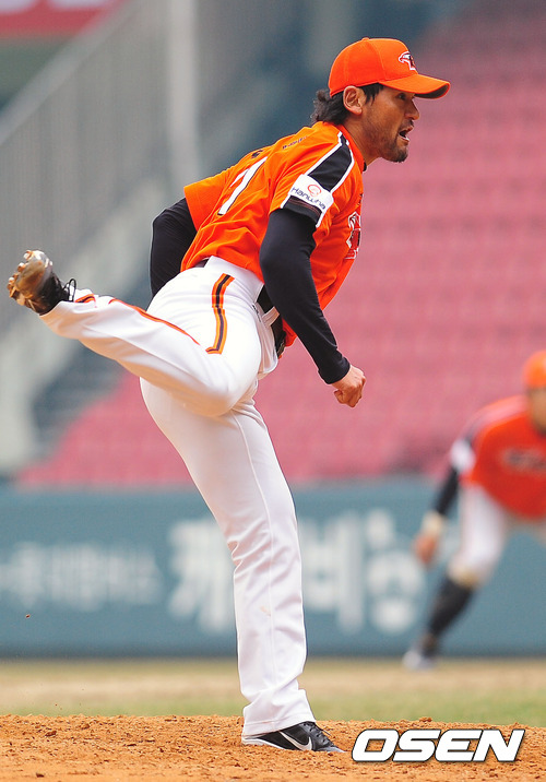 30일 오후 서울 잠실구장에서 LG 트윈스와 한화 이글스의 프로야구 시범경기에서 4회말 한화 선발 박찬호가 세명의 타자를 전부 삼진 처리하고 있다.