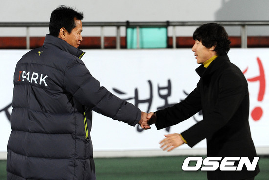 30일 오후 경기도 성남 탄천종합운동장에서 열린 '현대오일뱅크 K리그 2012' 성남 일화와 부산 아이파크의 경기, 경기 전 부산 안익수 감독과 성남 신태용 감독이 악수는 나누고 있다.
