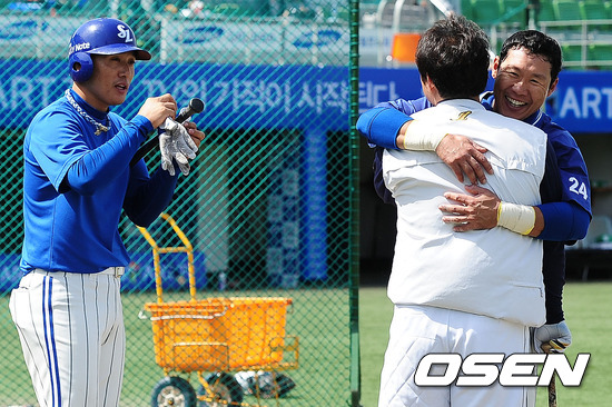 경기전 삼성 이승엽 강봉규가 두산 김동주와 인사를 나누고 있다.