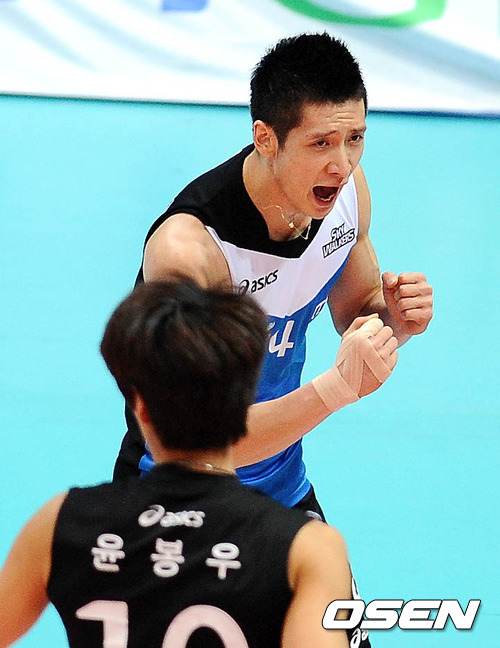 31일 오후 인천 도원실내체육관에서 벌어진 '2011~2012 프로배구' 플레이오프 1차전 대한항공과 현대캐피탈의 경기, 1세트 현대캐피탈 문성민이 득점에 성공하고 환호하고 있다.
