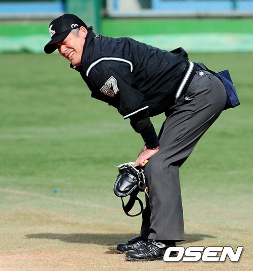 8회초 무사 두산 이성열 타석에 김병주 구심이 볼에 맞아 괴로워하고 있다.