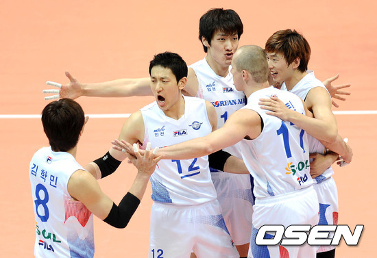 31일 오후 인천 도원실내체육관에서 벌어진 '2011~2012 프로배구' 플레이오프 1차전 대한항공과 현대캐피탈의 경기, 1세트 대한항공 선수들이 득점 후 환호하고 있다.