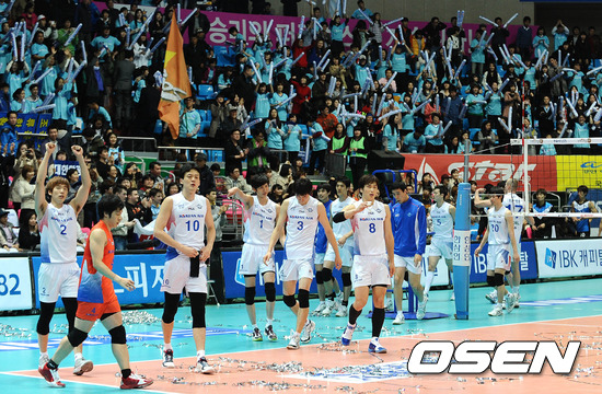 대한항공은 31일 인천 도원실내체육관에서 벌어진 2011-2012시즌 NH농협 V리그 남자부 플레이오프 1차전에서 현대캐피탈을 풀세트 접전 끝에 세트스코어 3-2(20-25, 21-25, 27-25, 25-22, 15-10)로 꺾고 먼저 1승을 기록했다. / sunday@osen.co.kr