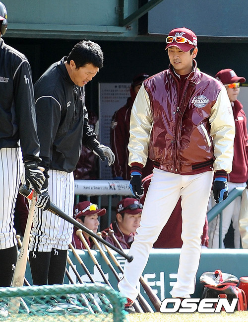 1일 서울 잠실야구장에서 열린 LG 트윈스와 넥센 히어로즈의 시범 경기, 경기 전 LG 최동수와 넥센 심수창이 이야기를 나누고 있다.