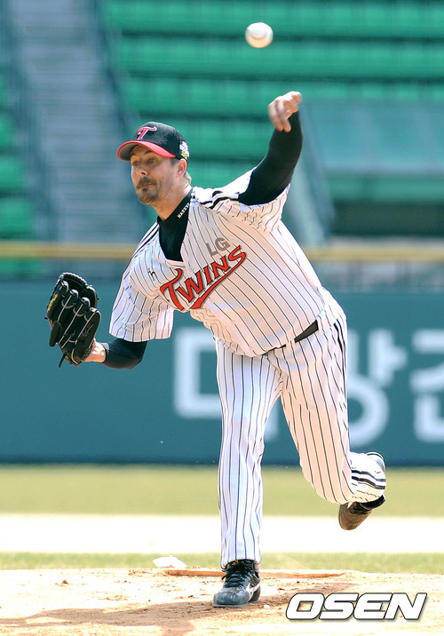 1일 서울 잠실야구장에서 열린 LG 트윈스와 넥센 히어로즈의 시범 경기, 1회초 무사에서 LG 선발 주키치가 힘차게 공을 던지고 있다.