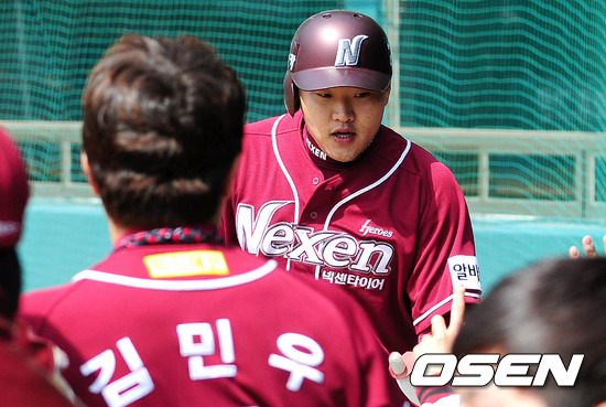 1일 서울 잠실야구장에서 열린 LG 트윈스와 넥센 히어로즈의 시범 경기, 2회초 2사에서 넥센 오재일이 선제 우월 솔로 홈런을 치고 덕아웃에서 동료들의 축하를 받고 있다.