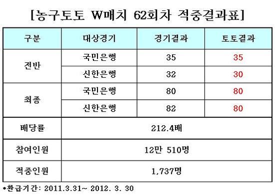 국민체육진흥공단이 발행하는 체육진흥 투표권 수탁사업자인 오리온그룹 계열의 스포츠토토㈜(www.sportstoto.co.kr)는 지난달 30일에 벌어진 2011-2012시즌 여자프로농구 WKBL 챔피언결정전 3차전 국민은행-신한은행전을 대상으로 한 농구토토 W매치 62회차에서 모두 1737명의 농구팬이 경기 결과를 정확히 맞혀 각각 베팅금액의 212.4배에 달하는 적중상금을 받게 됐다고 밝혔다.