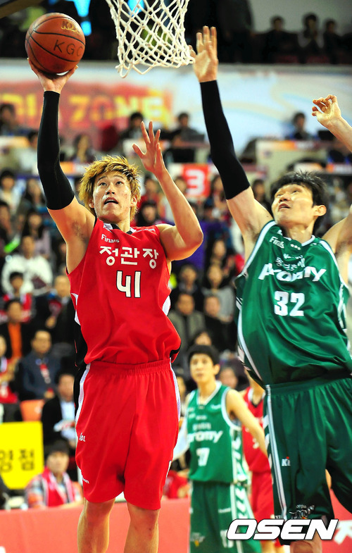 1일 안양 실내체육관에서 열린 '2011-2012 KB국민카드 프로농구' 챔피언결정전 4차전 안양 KGC 인삼공사와 원주 동부의 경기 1쿼터 KGC 오세근이 골밑슛을 넣고 있다.