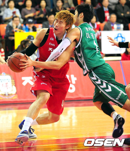 1일 안양 실내체육관에서 열린 '2011-2012 KB국민카드 프로농구' 챔피언결정전 4차전 안양 KGC 인삼공사와 원주 동부의 경기 2쿼터 KGC 오세근이 동부 이광재로 부터 인텐셔널 파울을 얻어내고 있다.