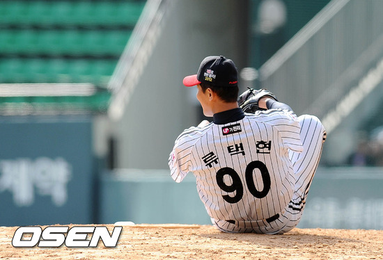 1일 서울 잠실야구장에서 열린 LG 트윈스와 넥센 히어로즈의 시범 경기, 8회초 1사에서 LG 류택현이 넥센 강정호의 타구를 잡으려다 넘어지고 있다.