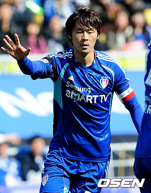1일 오후 수원월드컵경기장에서 열린 '현대오일뱅크 K리그 2012' FC 서울과 수원 삼성의 경기, 전반 수원 곽희주가'북벌' 완장과 동료 곽광선 부친상으로 검은색 리본을 차고 경기에 나서고 있다.