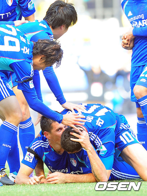 1일 오후 수원월드컵경기장에서 열린 '현대오일뱅크 K리그 2012' 수원 삼성과 FC 서울의 경기 전반 수원 스테보가 추가골을 넣고 환호하고 있다.