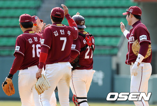 경기 후 넥센 선수들이 승리의 기쁨을 나누고 있다.