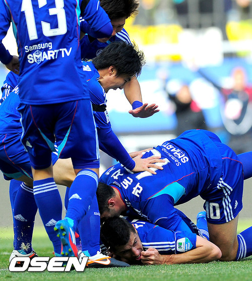 1일 오후 수원월드컵경기장에서 열린 '현대오일뱅크 K리그 2012' 수원 삼성과 FC 서울의 경기 전반 수원 스테보가 추가골을 넣고 환호하고 있다.