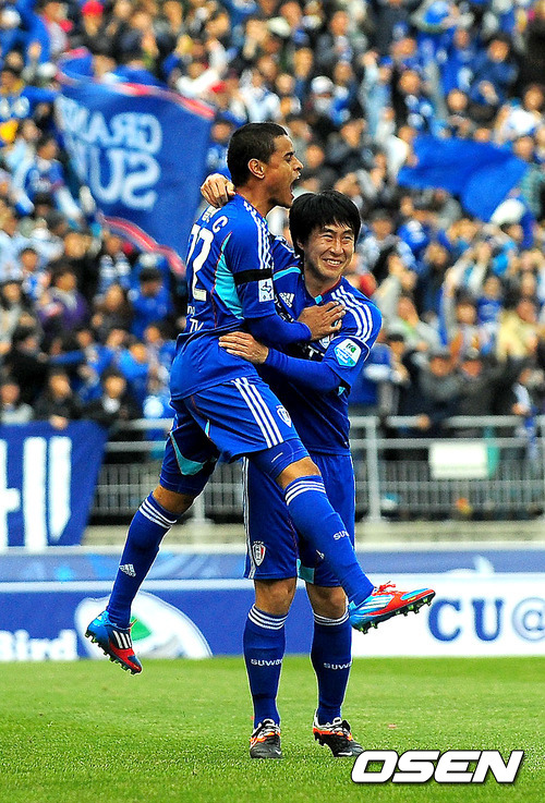 1일 오후 수원월드컵경기장에서 열린 '현대오일뱅크 K리그 2012' 수원 삼성과 FC 서울의 경기 전반 수원 에빌톤C가 박현범의 선취골을 어시스트 기록하며 환호하고 있다