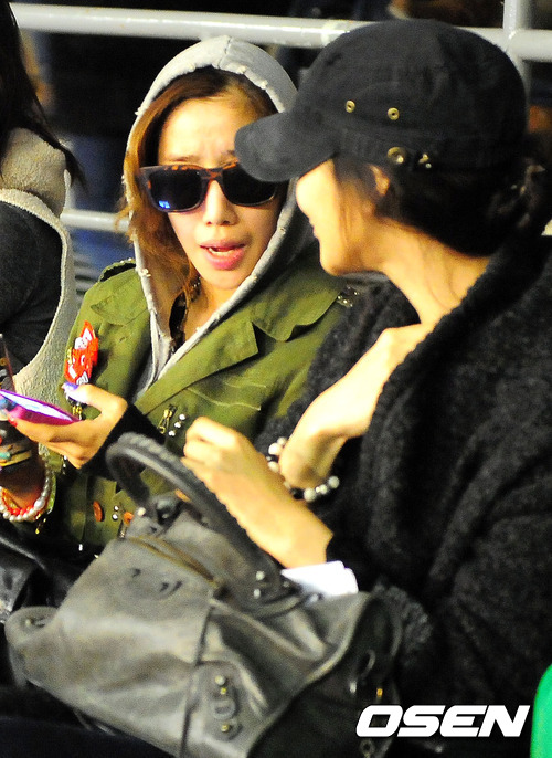 1일 오후 올림픽공원 체조경기장에서 열린 그룹 인피니트 앵콜 콘서트 'Second Invasion-Evolution'시작 전 쥬얼리 멤버 하주연이 지인과 이야기를 나누고 있다.