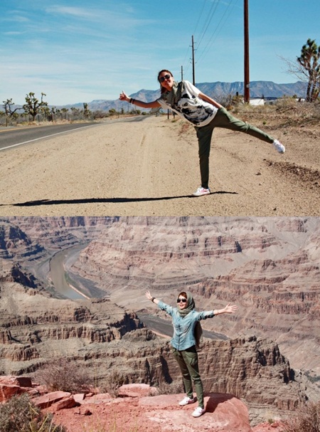 이어 게재된 다른 사진을 통해서는 "그랜드 캐니언... 으아... 자연의 신비함이란. 그저 감탄의 연속" 이라며 그랜드 캐니언에 푹 빠진 듯 만세 포즈를 취한 모습이다.