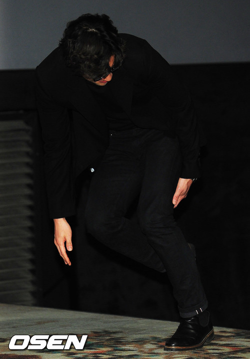 2일 오후 서울 건대입구 롯데시네마에서 열린 영화 '인류멸망보고서' 언론 배급시사회에서 류승범이 계단을 올라오다 계단에 걸려 균형을 잃고 있다.