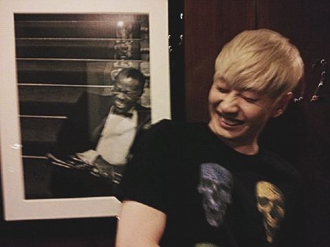 사진 속 은혁은 흑백으로 촬영된 루이 암스트롱 사진 앞에서 그의 웃는 모습을 그대로 흉내내고 있다. 특히 은혁은 루이 암스트롱이 눈을 감으며 웃을 때 눈가에 잡히는 주름마저 모방, 탁월한 모사 실력을 뽐내고 있다.