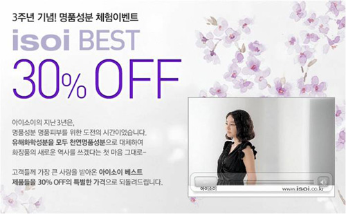 아이소이(isoi)가 창립 3주년을 맞아 '30% OFF 고객 특별 체험 이벤트'를 진행한다. 아이소이는 '명품크림 발라도 왜 피부가 명품이 되지 않을까요?' 라는 독특한 광고문구로 주목 받고 있는 화장품 브랜드다.