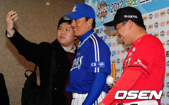 한 야구팬이 삼성 이승엽하고 사진 촬영을 하자 SK 정근우가 어색한 웃음을 짓고 있다.