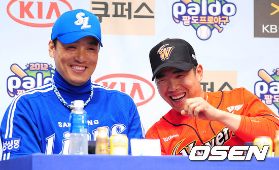 정근우 이승엽이 미디어데이에서 미소를 짓고 있다.