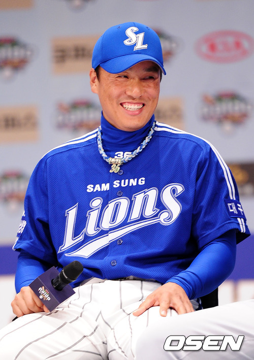 삼성 이승엽이 질문에 답을 하며 즐거워하고 있다.