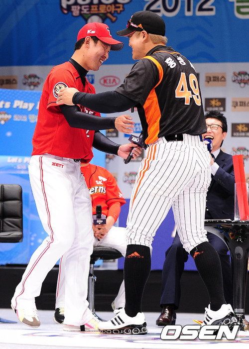 KIA 윤석민과 롯데 홍성흔이 포옹을 하고 있다. 윤석민이 가장 상대하기 어려운 타자 질문에 홍성흔이라 답을 하자 MC가 포옹을 요구했다.
