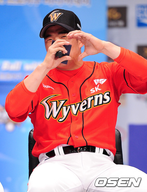 SK 정근우가 아내를 향해 손가락으로 하트를 그리고 있다.