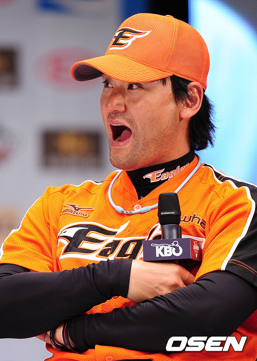 한화 박찬호가 입을 벌리며 질문에 귀기울이고 있다.