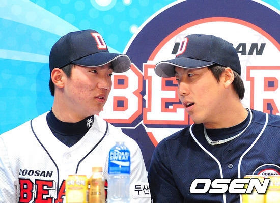김현수가 두산 신인선수 변진수와 대화를 나누고 있다.