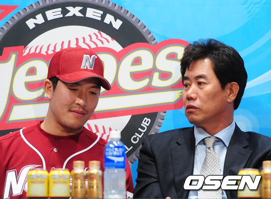 김시진 감독과 김병현이 이야기를 하고 있다.