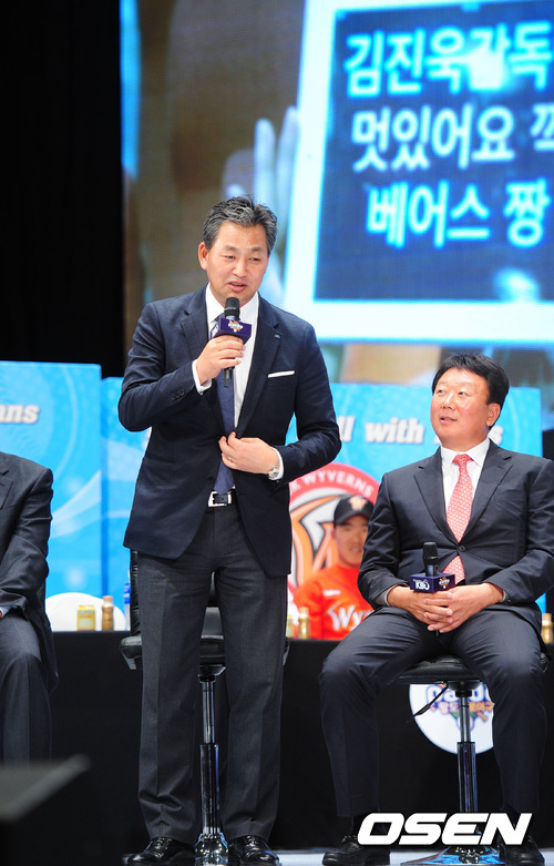 사회자의 훈남 감독 질문에 두산 김진욱 감독이 답변을 하고 있다.
